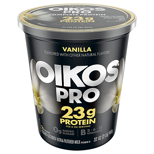Oikos Pro Vanilla Yogurt-Cultured Ultra-Filtered Milk packs a punch with 23g protein per 6 oz serving to help support strong muscles,* 50% more protein than average Greek yogurt.** Each serving contains complete protein (all nine essential amino acids), 0g added sugar*** and is a good source of vitamin D and calcium for strong bones. This high protein snack contains no artificial flavors or colors from artificial sources. Oikos Pro is a convenient solution for adding complete protein to your diet, making it a great choice for professionals, students and athletes looking for post workout snacks. Enjoy as an afternoon pick-me-up or add to protein shakes and smoothies.